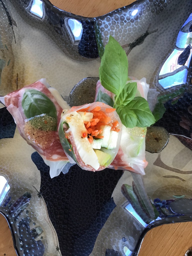 Here’s another one of my imaginative spring roll combinations. We’ve still got the basic veggies, but alongside them we have some Italian inspired additions including a spicy Soppressata, some fresh, creamy mozzarella, and a fragrant hint of basil. Another refreshing summer time snack!