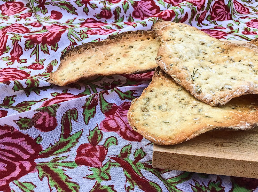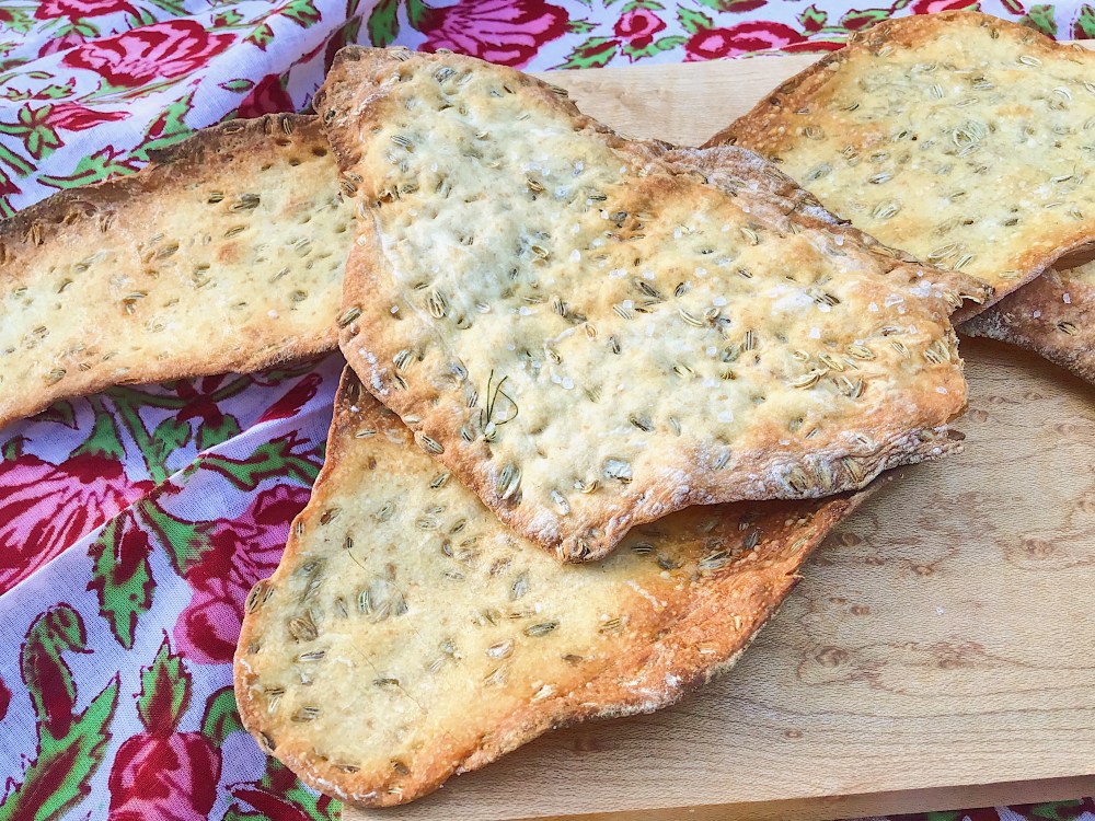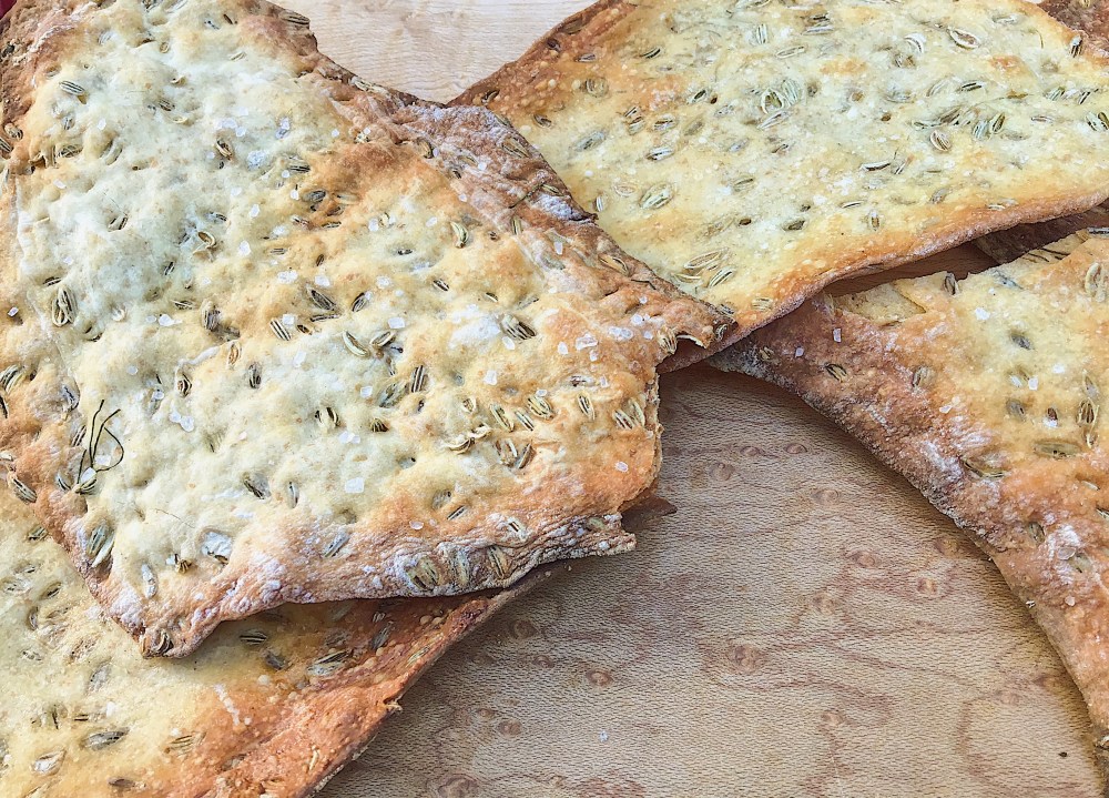 More DILL! Last week it was dill pickles and dilly beans, this week I sandwiched fresh dill into my fennel crispbreads. I used my pasta machine to get these nice and thin, and I folded in the dill using the same method one would use for creating handkerchief pasta. I used my wild yeast starter for leavening in this recipe, but I’ve also made these before with regular commercial yeast. I have included instructions on how to adapt the recipe to that end. This recipe has been adapted from the Tartine cookbook.