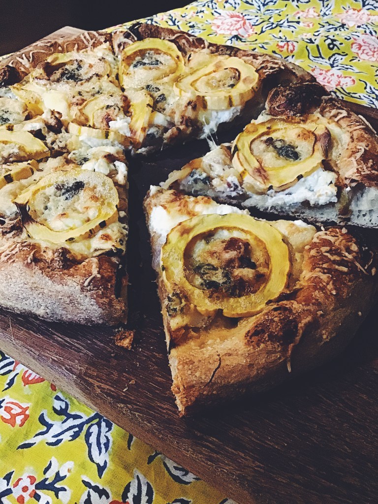 The Delicate seems to be the new favorite Autumn squash, at least, to US markets. It’s been around the culinary world for several years now, but it just now seems to be picking up steam in the home kitchen and can now be readily be found in commercial grocery stores (although, I still get mine from the local farm stand). It’s light, it’s flavorful, and you don’t have to peel it – what’s not to love! In this recipe I serve it up as a flatbread on a bed of creamy ricotta with caramelized onions and a sprinkling of blue cheese.