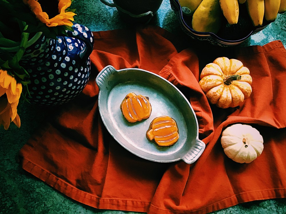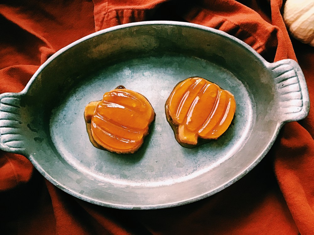 A little Halloween treat! I’ve been going pumpkin crazy this year – pumpkin this – pumpkin that – and here’s yet another pumpkin recipe to add to the mix. Pumpkin flan is a great gluten-free alternative to pumpkin pie. It has the same basic ingredients – eggs, milk, pumpkin, sugar, spices – but with that deliciously, unique flan taste. After all, how can you go wrong with caramel?! For those new to flan, it’s a popular Latin American custard dessert. I baked these in little silicon pumpkin and owl shaped molds (the pumpkins turned out better then the owls in this go around). Baking flan in the mini silicon molds was a bit of a challenge especially when it came to the water bath; there was floating, there was flooding, and there was plenty of cursing. But if you feel up for the challenge, they did turn out cute, if your not up for the challenge, baking the flan in ramekins works just as well and taste just as good!