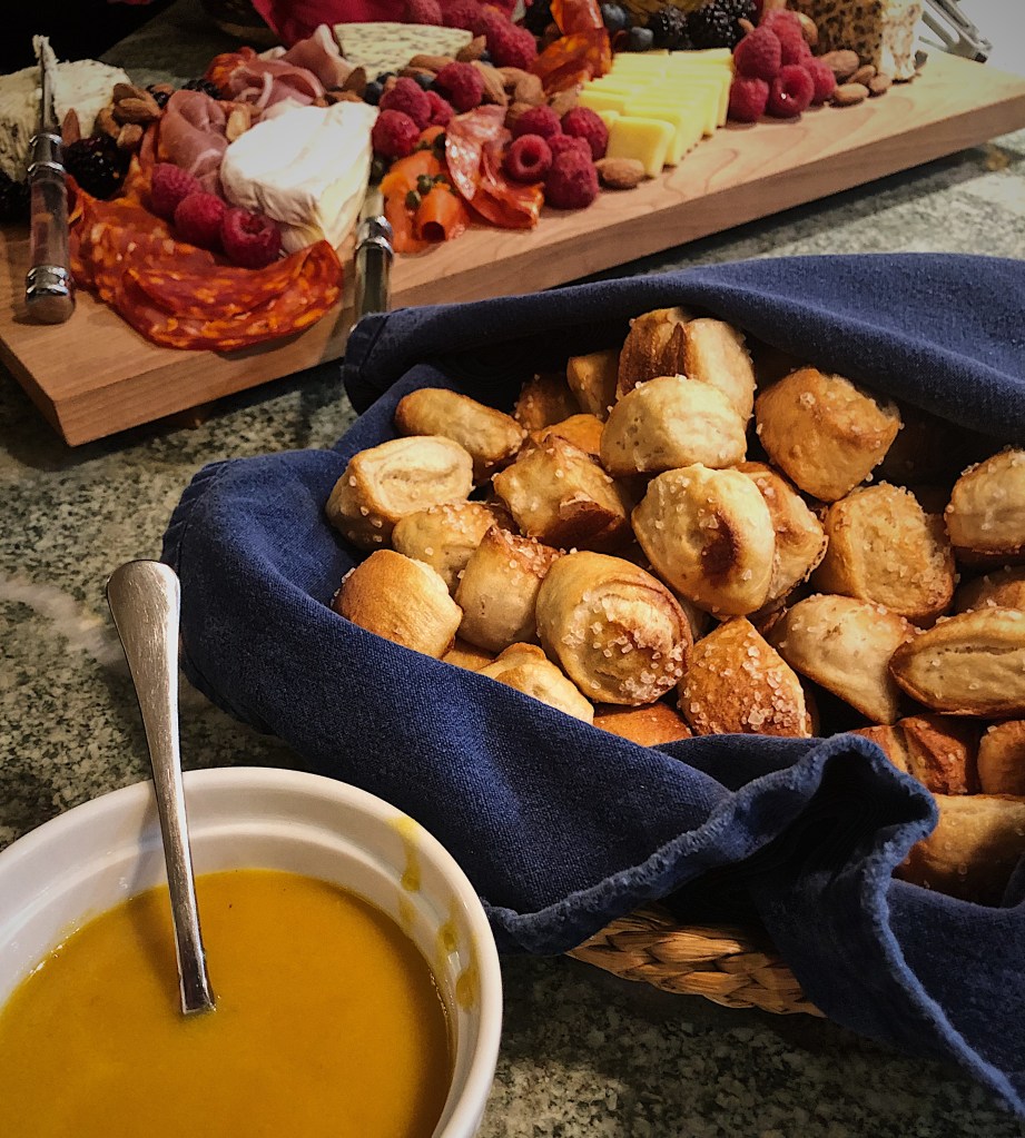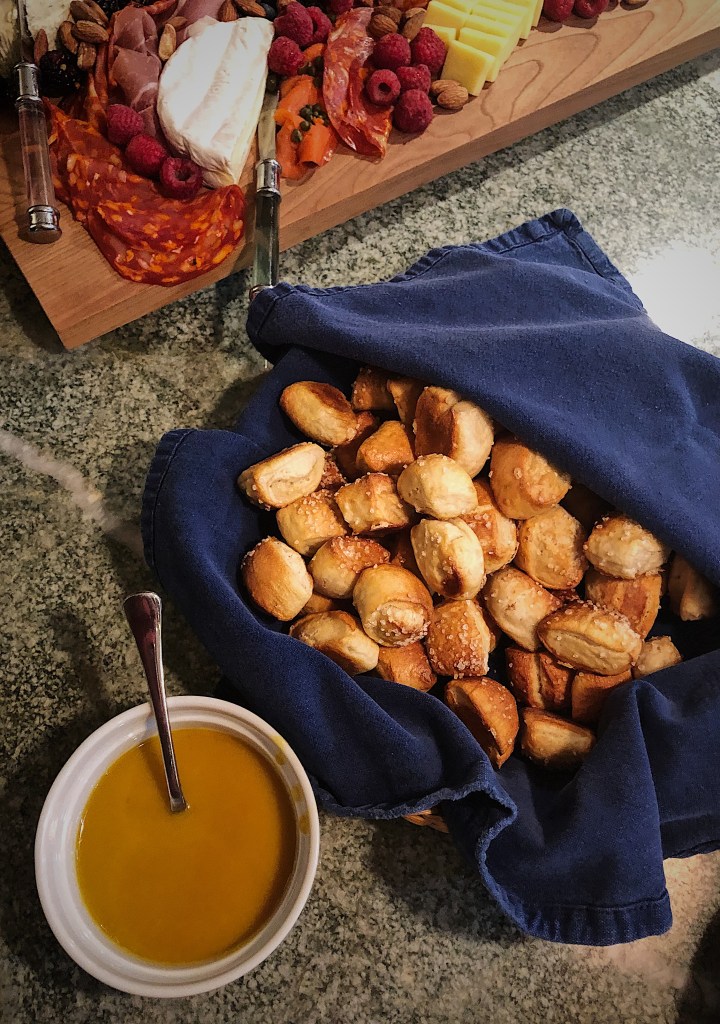 I made a batch of these bites last week for some election night nibbles, and I realized I haven’t yet shared this recipe with you. I cranked out hundreds of these last year, during the 2019 wedding season, as late night snacks. At this point, I can almost bake them in my sleep! This is aided by the fact that they are ridiculously easy to throw together and bake. The nice thing about making pretzel bites is that you don’t have to actually shape the individual pretzels – game changer! Just roll your dough into a log and chop! chop! It’s a great dough to make ahead of time, and leave in the fridge overnight. You can also make a large batch, and keep them in the freezer until you are ready to bake them. I made an easy honey mustard dipping sauce to serve alongside them. The recipe is also below.