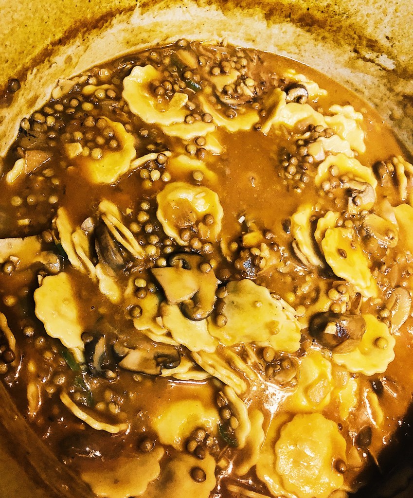 - Cook for about 20 minutes with the lid off, allowing the water to cook off slightly, if the water levels get too low feel free to add some more. At this point the lintels should be mostly cooked. If your using store bought pasta, you might want to add it in around the 15 minute mark since it needs a little more time to cook then the fresh pasta.